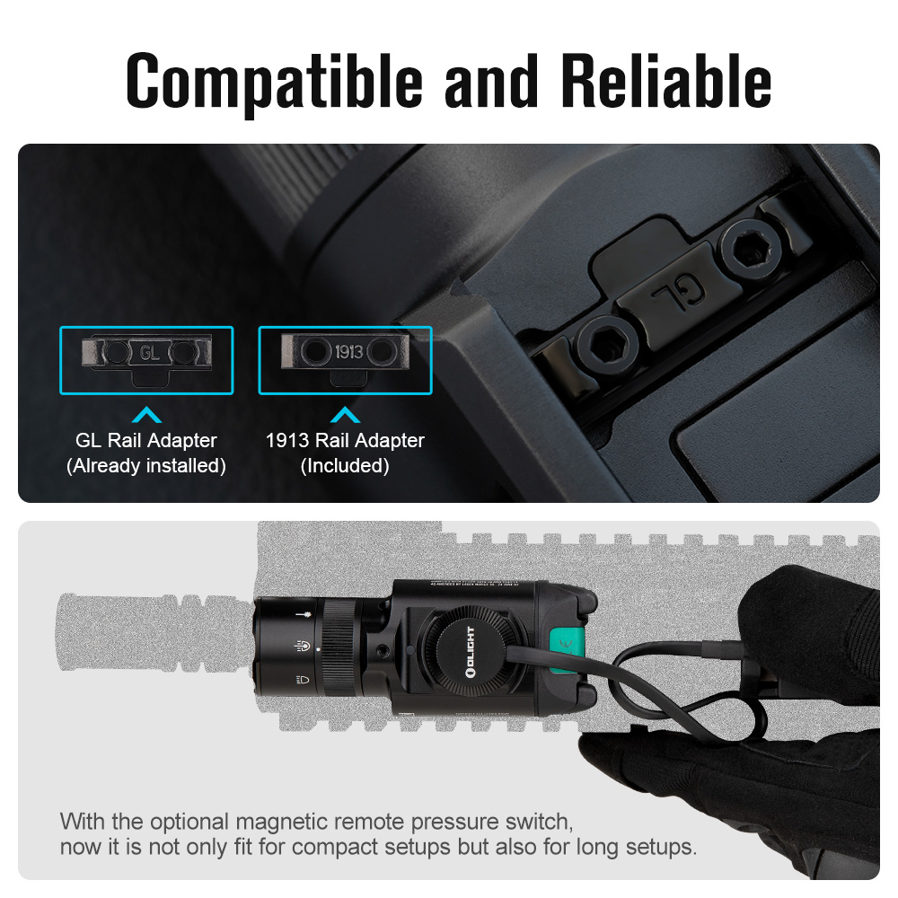 - Compatible with PIC & GL Rails: Works with GL and PIC sized rails while proven to withstand high recoil and impact. Quickly attach and detach the light with the locking swing arm and switch to any setup, anytime.